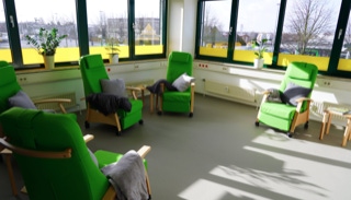 Gemütliche und funktionale Sessel laden zum Ausruhen ein. Warmes Licht, ebenerdige und barrierefreie Räumlichkeiten sorgen dafür, dass jeder Gast sich problemlos und angenehm in der Tagespflege bewegen kann.